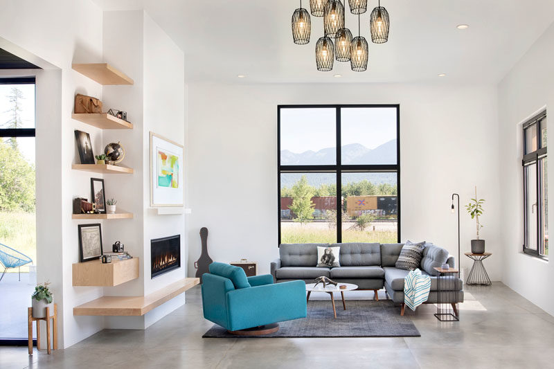 Inside, high ceilings, like in the living room, help to create an open and airy interior, while the windows frame the landscape, and a built-in fireplace helps keep the room warm on a cool night.