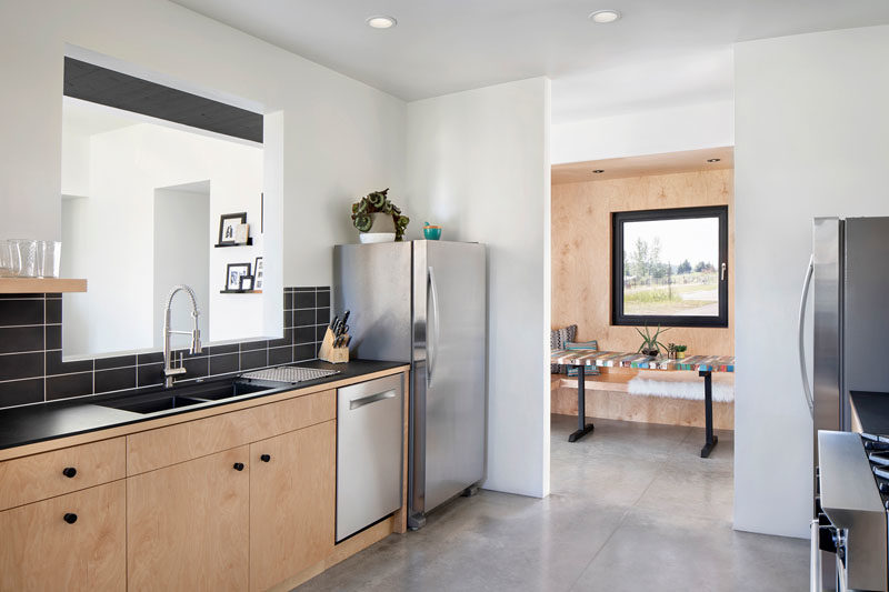 In the kitchen, black tile matches the black countertops, while the wood cabinets complement the wood used on for the casual breakfast nook.