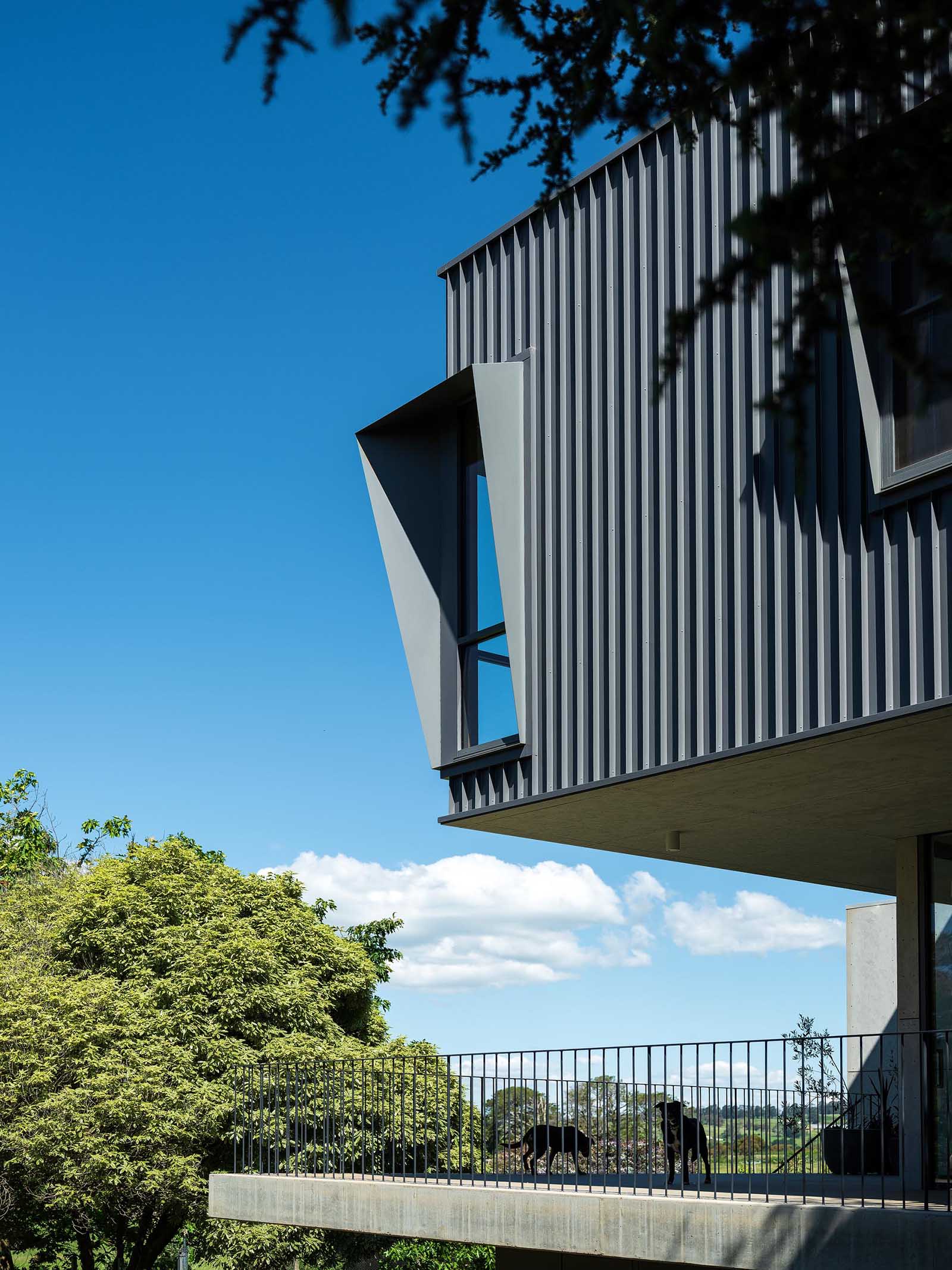 The modern black metal exterior has angled window frames that protrude away from the home, blocking the sun and offering a shaded interior.