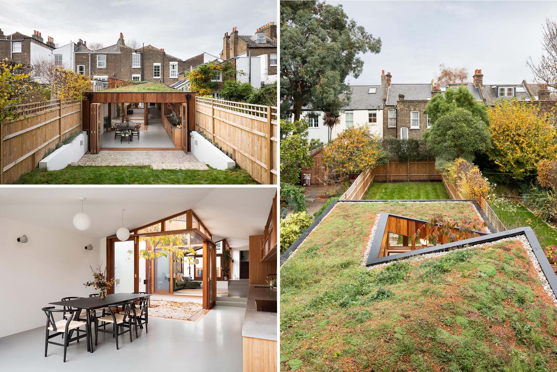 As part of the remodel, the home received a modern wood extension that opens up to the backyard and is covered in a green roof.