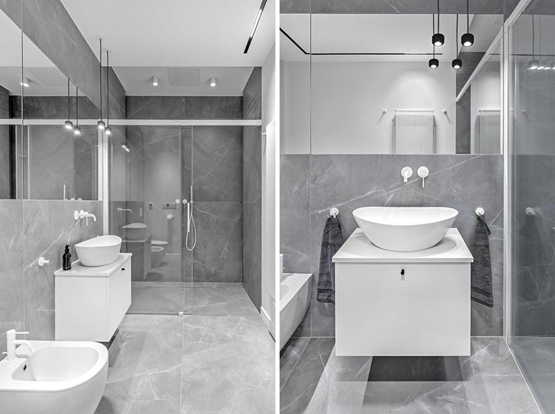 In the bathroom, large format grey tiles cover the walls and floors, while a floating white vanity complements the faucets and hardware.