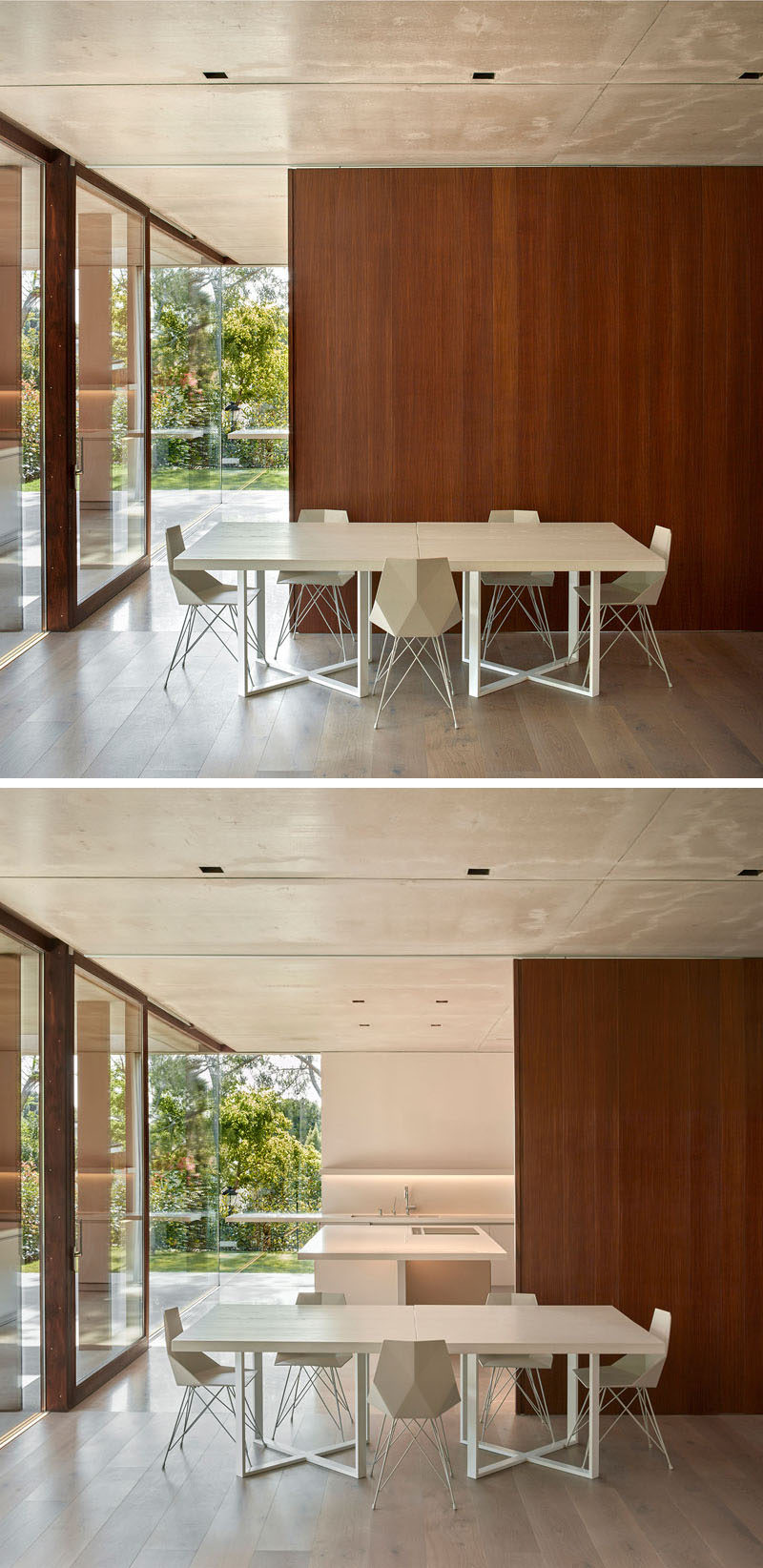Back inside, the dining room is minimal with white table and chairs, while a wood wall slides open to reveal the kitchen behind it.