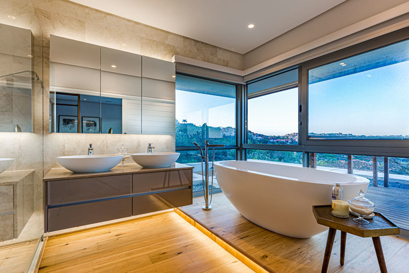 In the master bathroom, the freestanding bathtub is raised up on a platform, while hidden lighting creates a soft glow and a calming atmosphere.