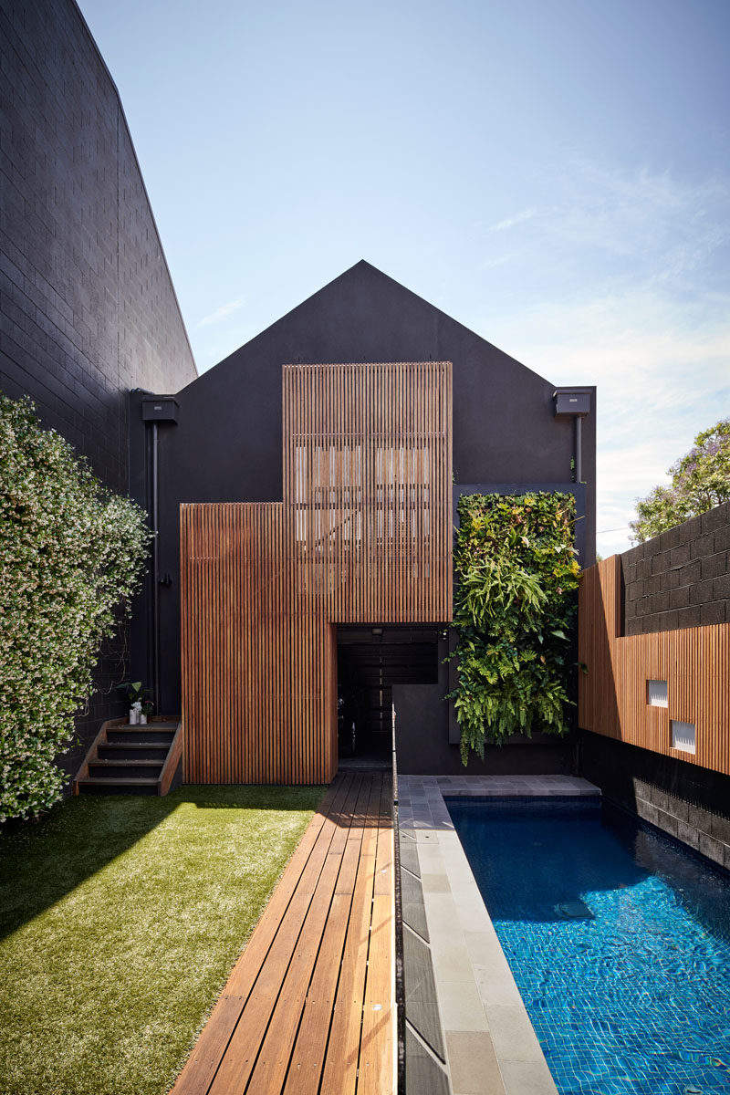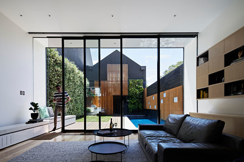 The house, designed by Matt Gibson Architecture and located in Melbourne, Australia, has sliding glass doors that open the living room to the outdoor space, that measures in at just 21 feet (6.55m) wide.