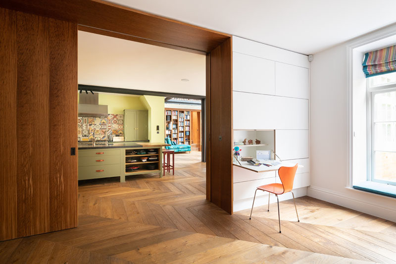 The room also has twin hidden writing desks that fold-down from the wall. A large wood pocket door connects the playroom with the kitchen and dining area.