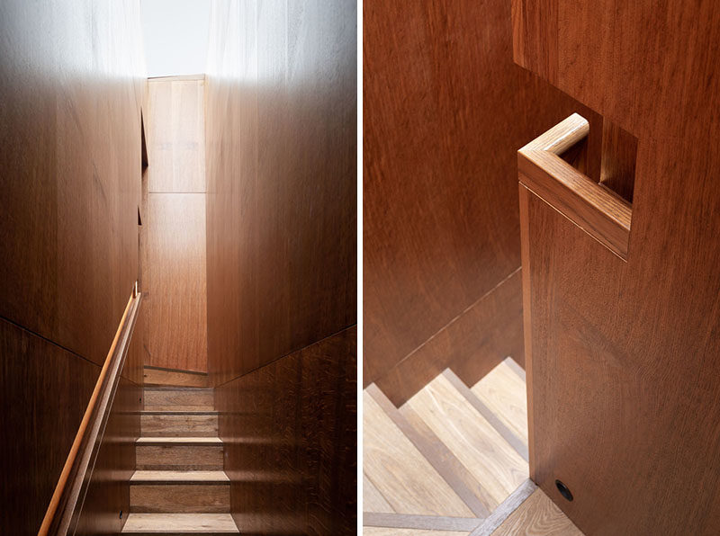 Recessed LED lighting guides the occupants up to the second story of the library, and highlights the careful craftsmanship of the integrated handrail.