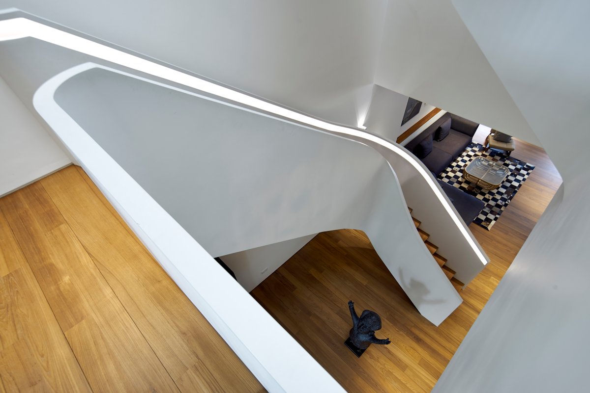 The top floor houses the master bedroom and a separate bathroom visually connected to the bedroom via a long slab of limestone that serves as the top counter of the bathroom’s vanity and continues onward into the corridor, forming a functional desk area amidst a bookshelf-lined wall. The skylight in the master bathroom illuminates both the bathroom and the balcony on the second floor with natural daylight.