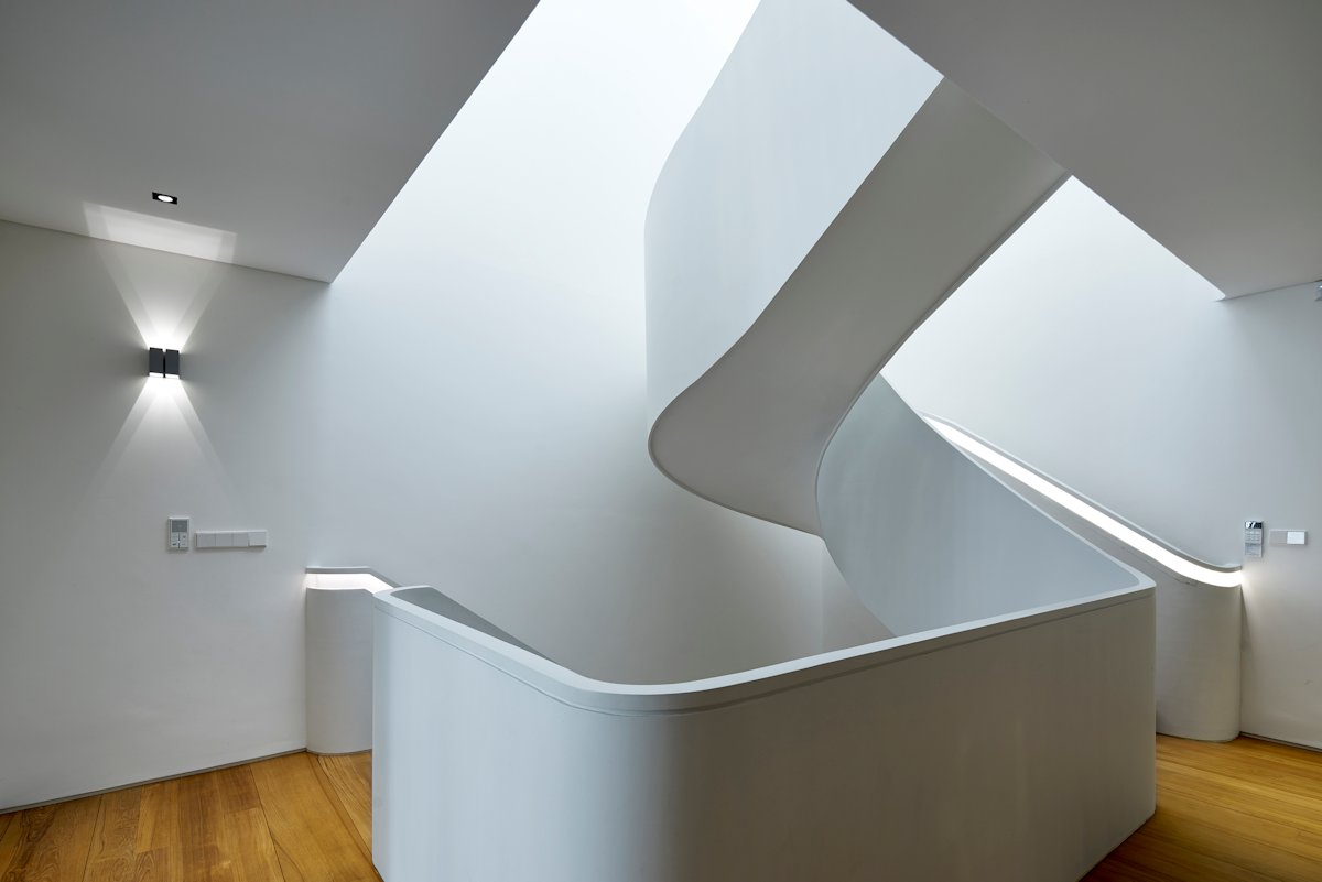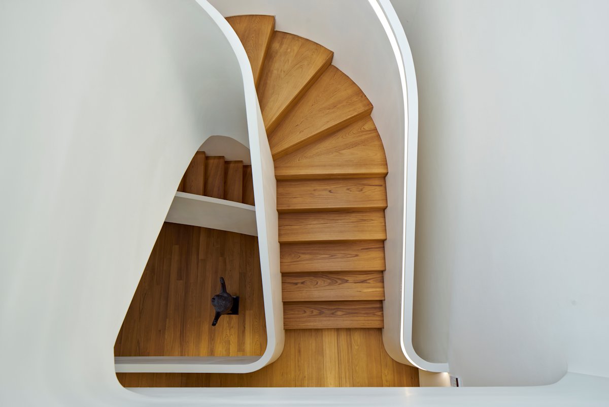 A dramatic spiral staircase spanning all three levels maximises vertical circulation while skylights in the jack roof directly above the staircase provide natural illumination. Timber beams installed in the ceiling of the first floor and the roof adds an old world charm to the home.