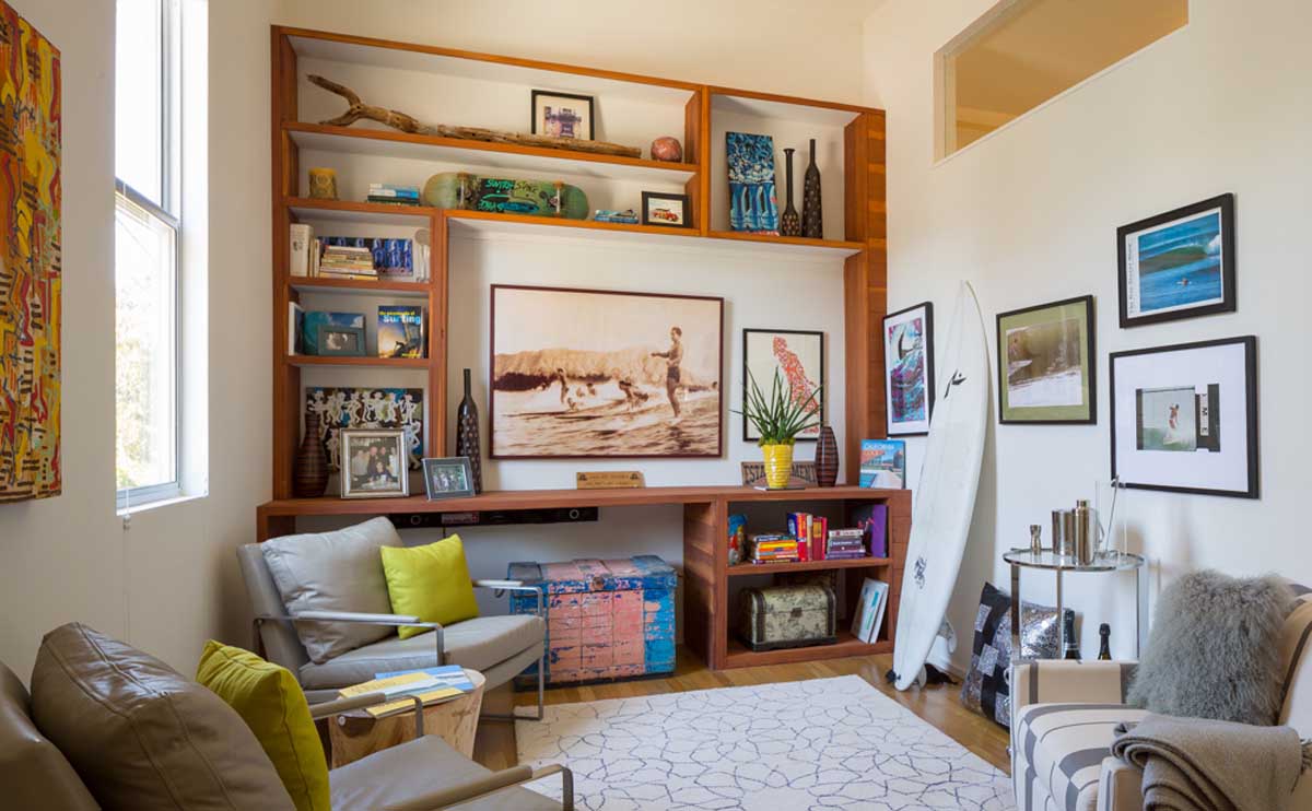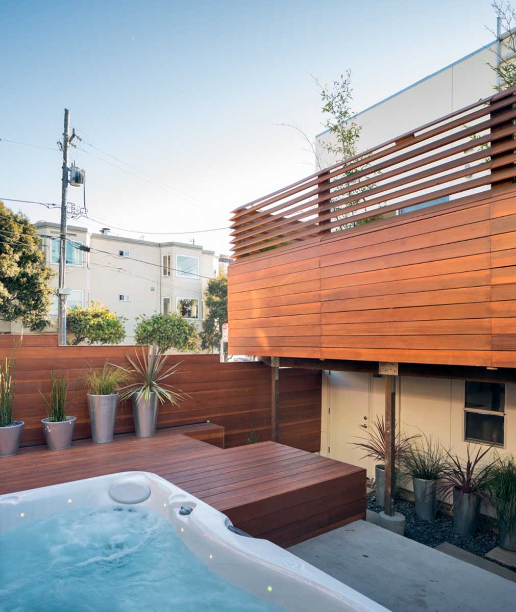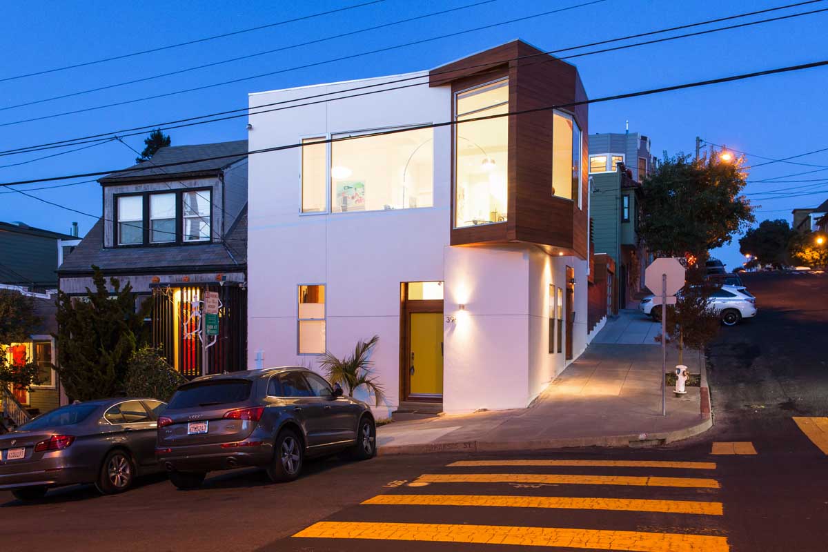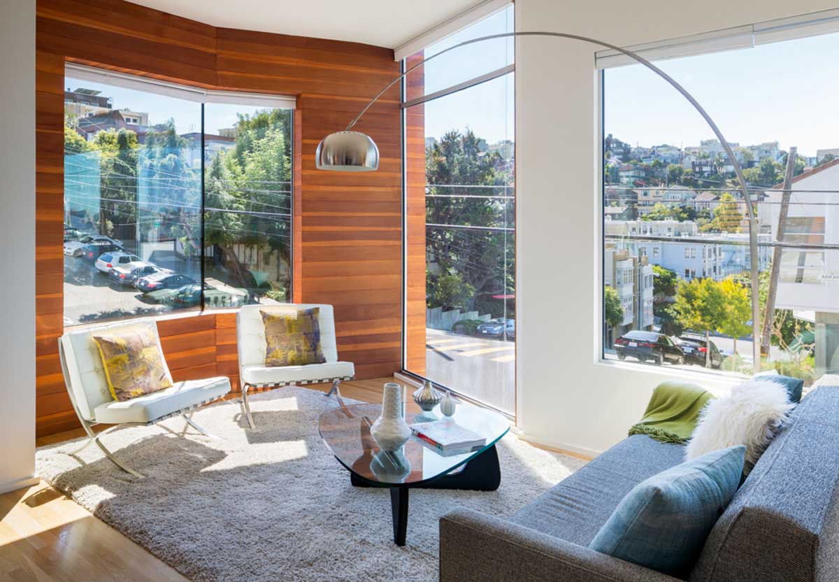 A wall of Redwood weaves through the project, appearing at entrances, the deck, the yard and on the volume of the garage. It ultimately terminates at the large cantilevered bay window, inflecting itself towards the view of downtown San Francisco and the Golden Gate Bridge. Two small, subdivided spaces are cleared of the even smaller subdivided walls, and unified into a singular open space.
