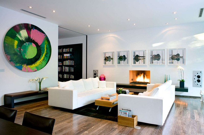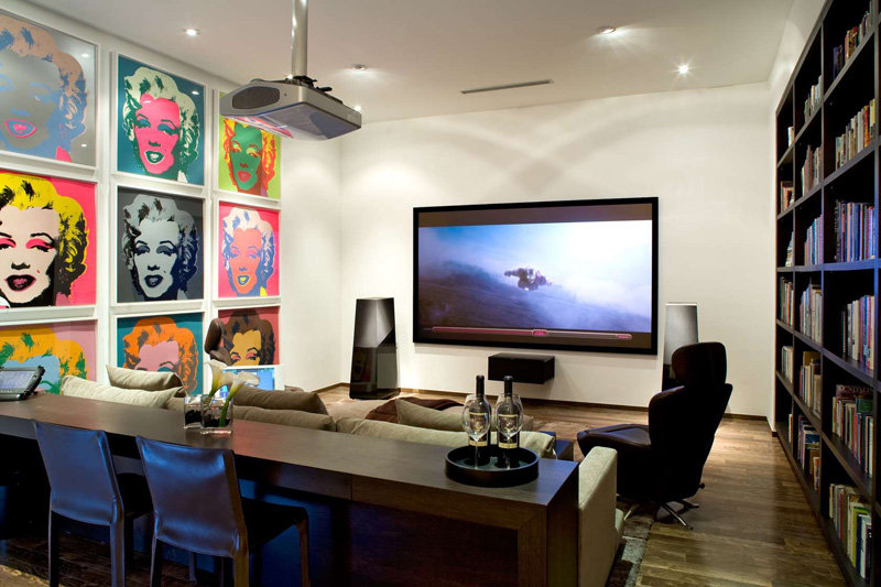 A Boffi kitchen is open to the dining/ living area with island seating for casual family eating.A giant floor to ceiling solid wood slab door recesses into wall to seamlessly join the main living area and home theatre. The rolling door seals shut for sound and light separation.