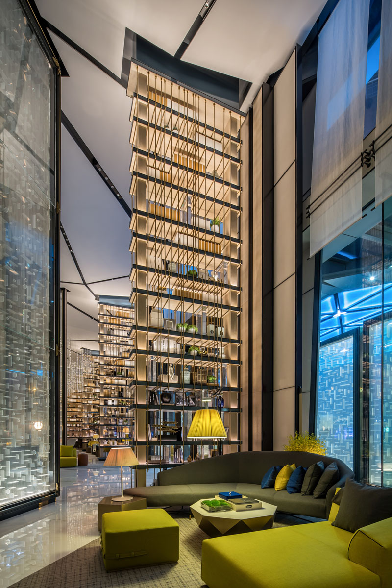 Huge vertical partitions and custom-made sofas line the long narrow hallway of the lobby, separating spaces from one another. The shelves of the partitions are lit, and are luxuriously decorated with various ornaments.