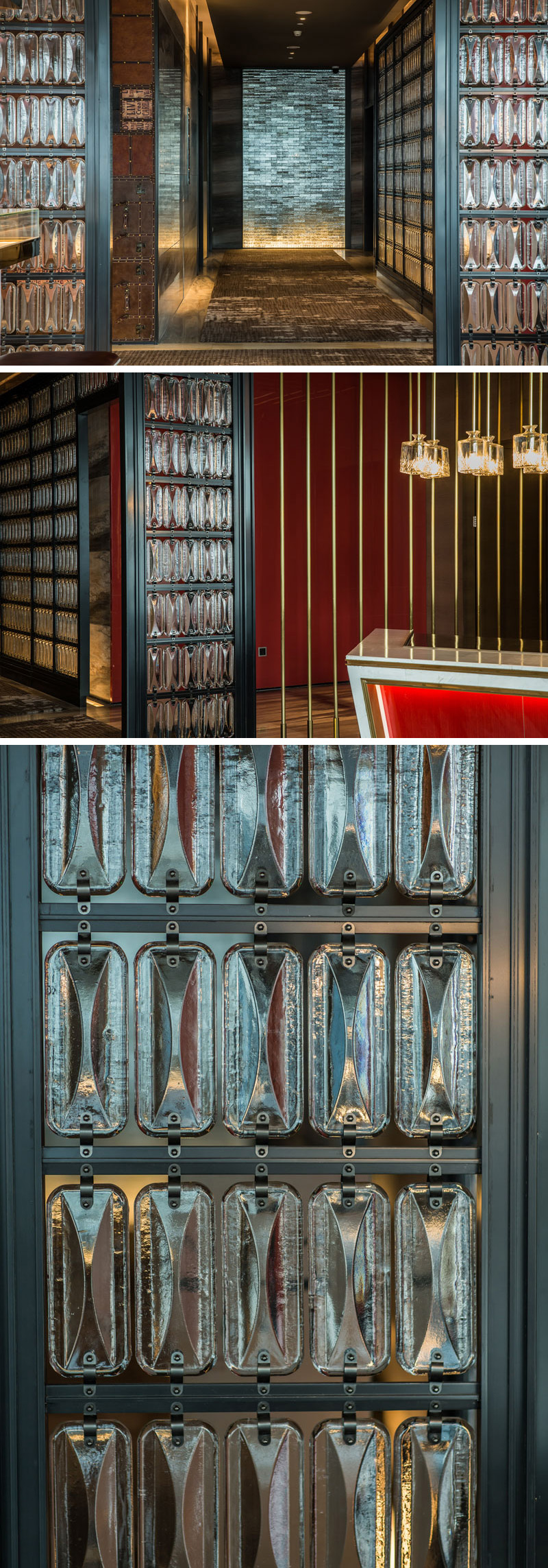 Decorative glass elements lead into the main bar which is adorned in red, black, and copper components, creating an slightly industrial atmosphere.