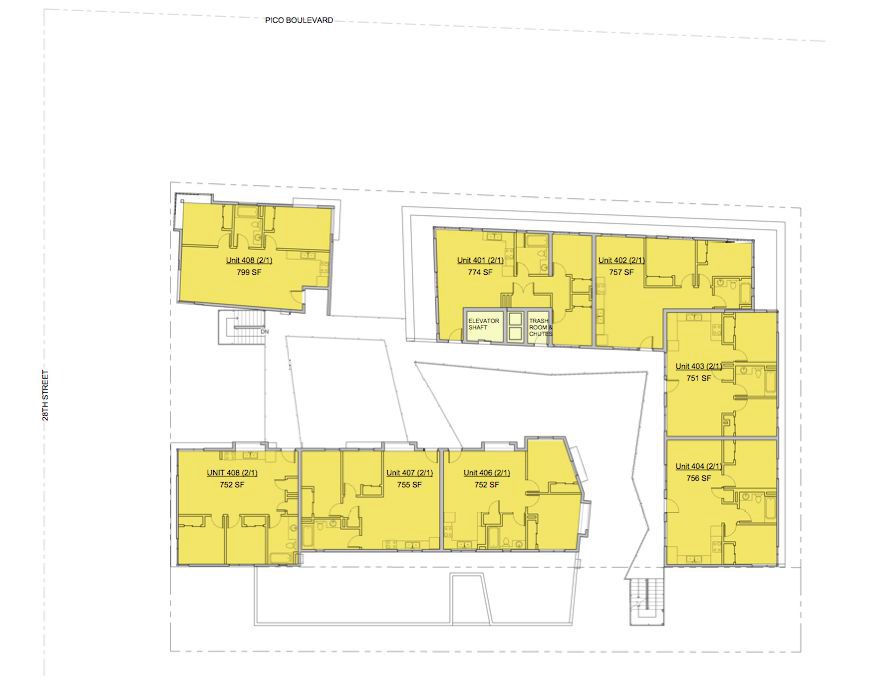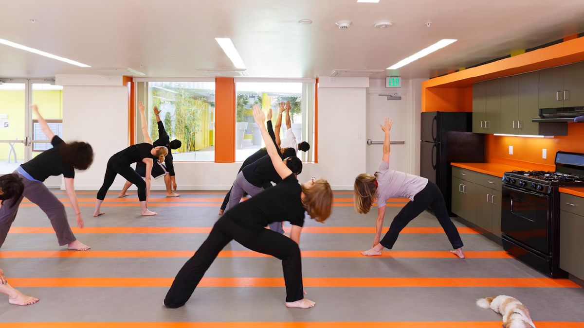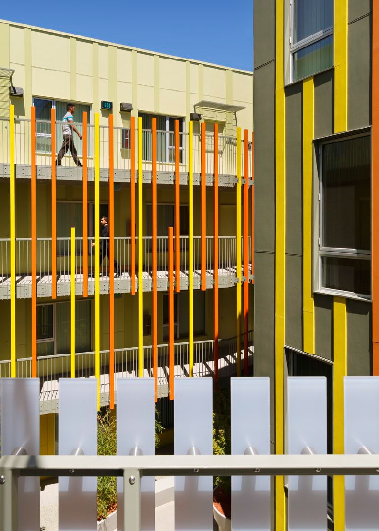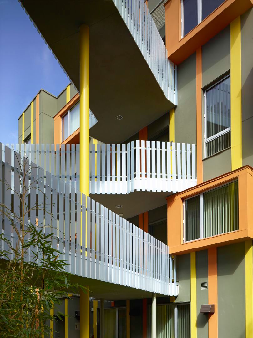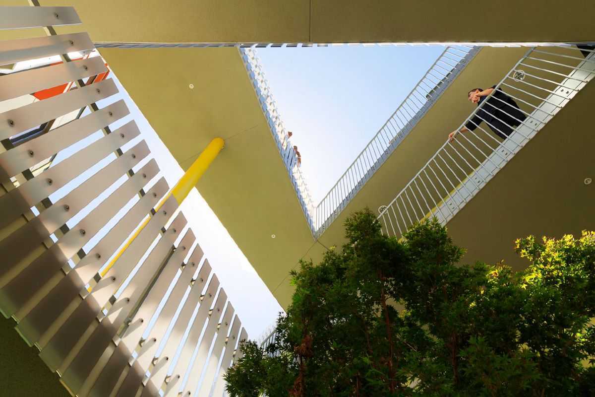 The project contributes to the life of its residents, neighbors and the City, by providing a pedestrian-friendly urban façade to enliven the corner of Pico and 28th streets. A break in the south façade provides pedestrian access and engages the interior courtyard with the surrounding street life. On the east, a two-story volume accommodating a community room helps to break down the mass and allows the ocean breeze to create naturally ventilated spaces. The courtyard as the social heart optimizes interaction and incorporates a playful array of bridges, walkways and stairs.