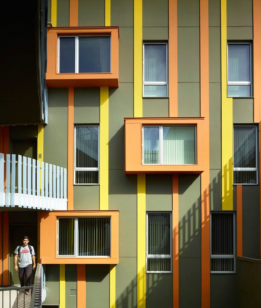 The architectural design emphasizes economy by using a layering approach of projected and recessed planes, and a simple palette of materials including multicolored cement board panels.