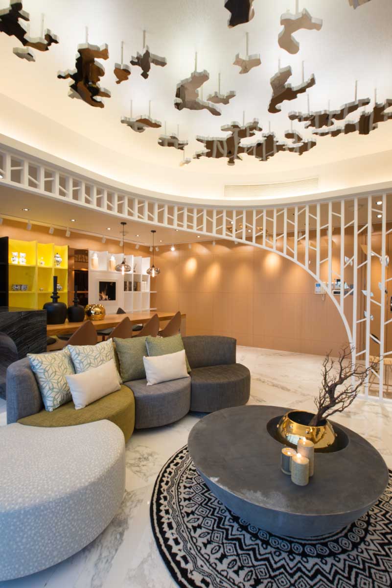 Abstract tree branches encircle the living area are accentuated by the autumn leaves which project along the curved decorative feature. This curved feature along with the reflective ceiling feature recreates an experience akin to laying under a tree with reveals of light breaking though the tree canopy. Earthy tones and choice of natural materials enhances the natural feeling within the space.
