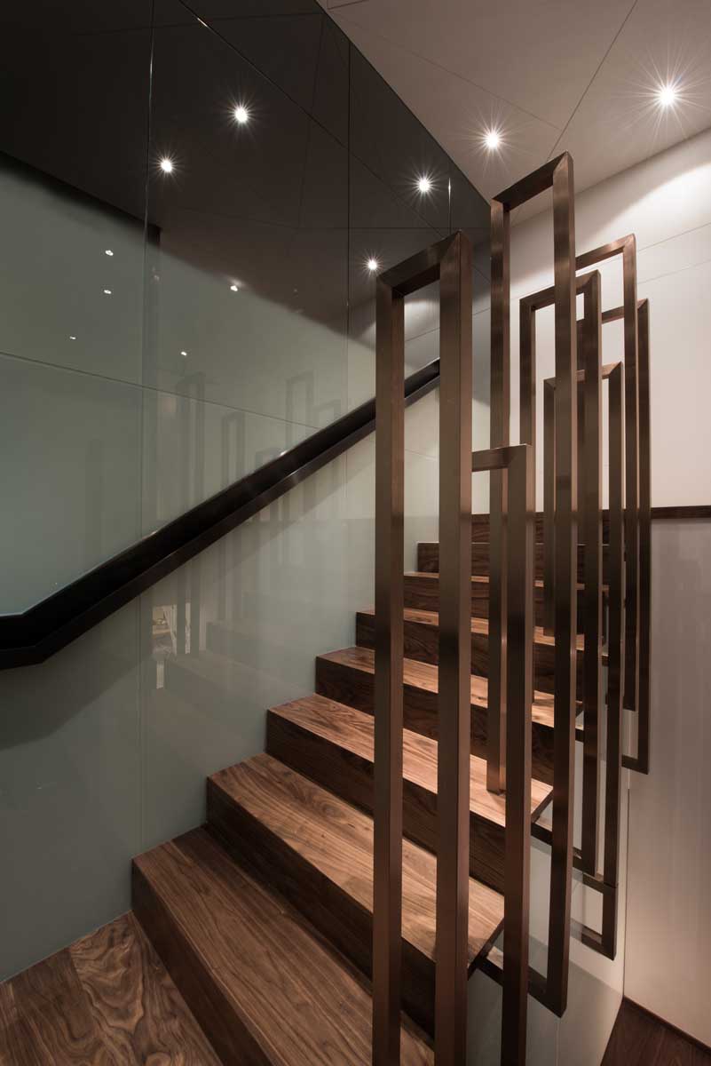 The stair features draws you in to continue the story as it unfolds towards the second floor. The rose gold finish brings life to the staircase. The handrail enhances the contemporary feel by implementing the elongated shape of tree stems. Adjacent to the living room, the ceiling of the second floor is designed with the pattern of abstract tree branches.