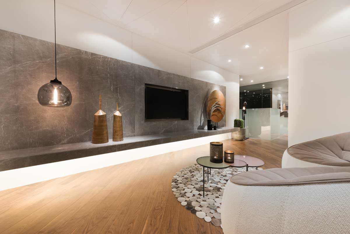 The wall hung grey marble TV wall extends along the corridor wall; the corridor opens up to a cozy corner for enjoying your favourite beverage. Contrasting with the material used on the wall, the warm wooden flooring covered with a stone shape rug captures the essence of nature.