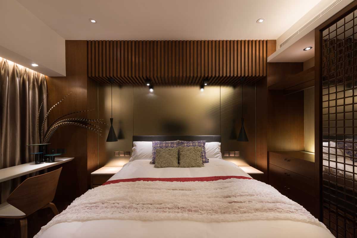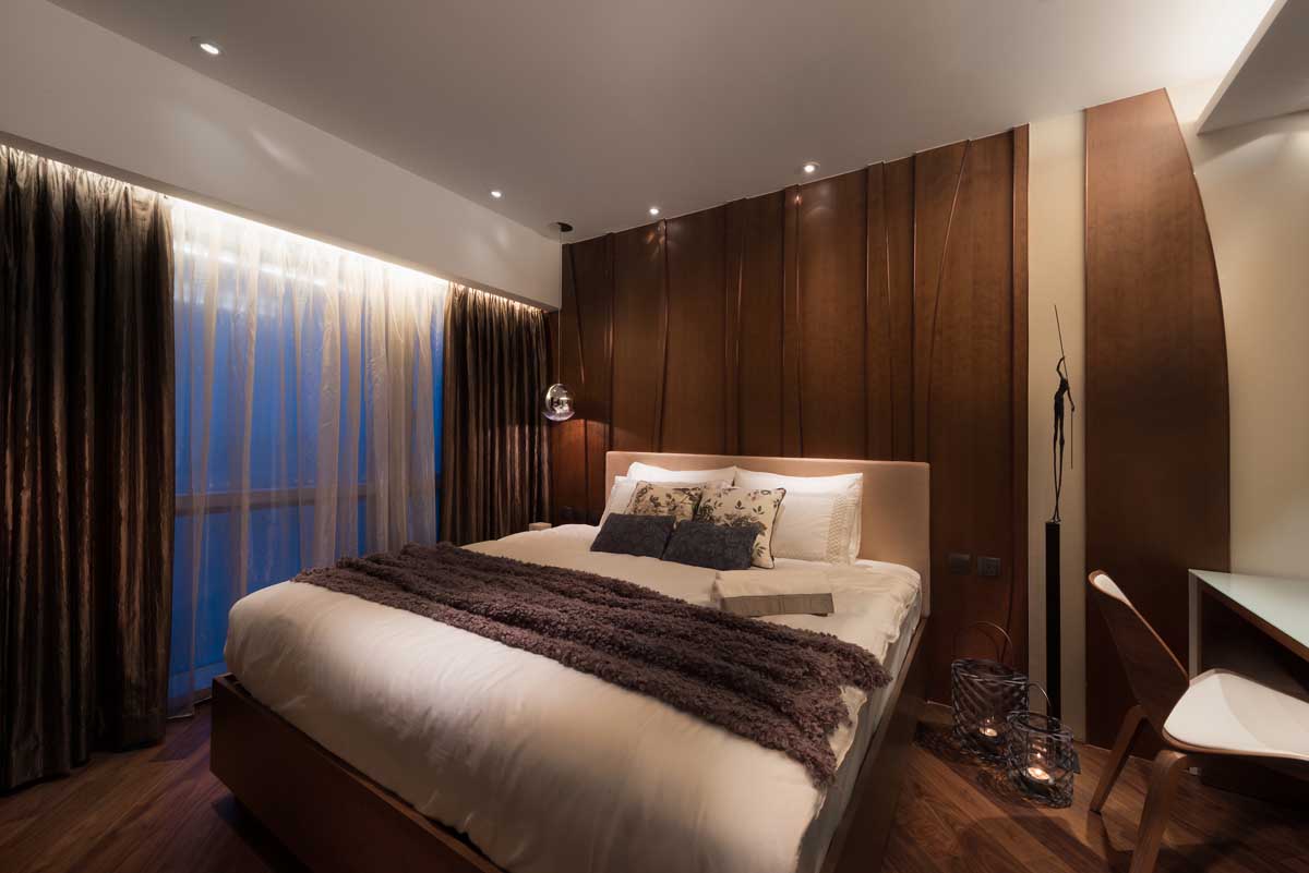 The master bedroom has been purposely designed in a deep brown color with a back wall feature designed to simulate tree trunks layered upon one another. As well as looking natural, the choice of colours and materials offers a sense of luxury in this area.