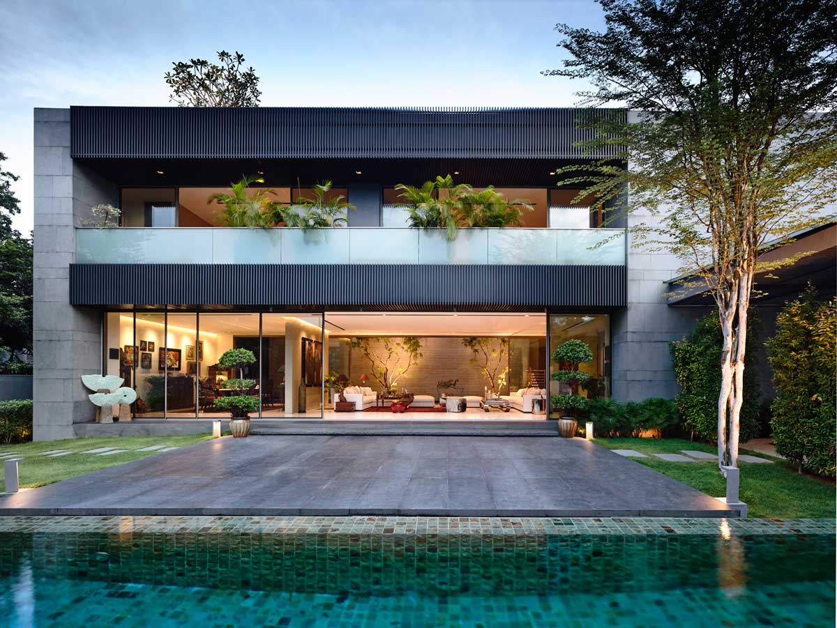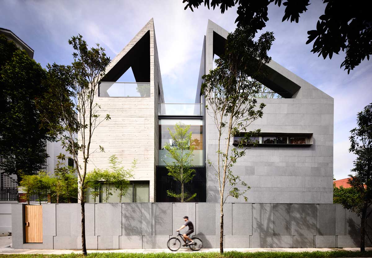 Just off Stevens Road is this Zen-inspired dwelling with strong architectural lines and shapes that are further accentuated by the materials used. Comprising two main volumes, the front block houses the social spots, such as the living and formal dining areas, whilst service functions are relegated to the back, along with the kitchen. Although visually similar, the blocks are distinguished by texture – the social activity block is clad in granite and the service block in fare-faced concrete.