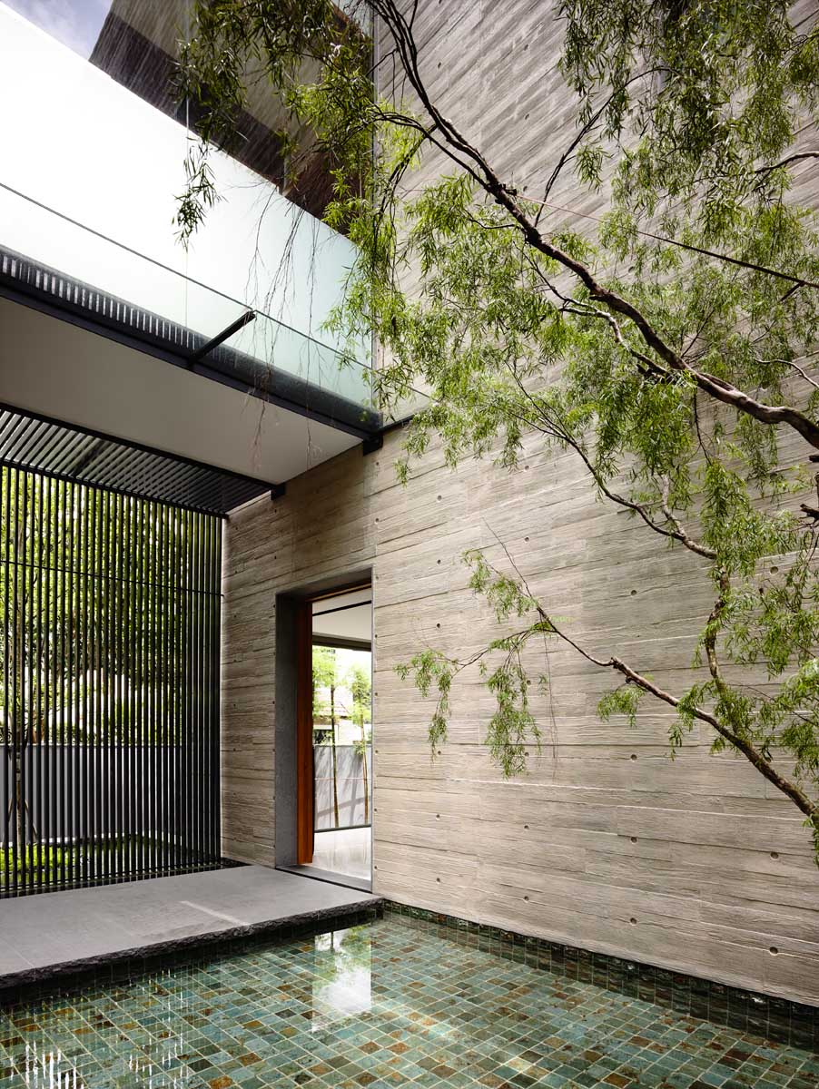 The design brief called for all spaces on the ground floor to form a cohesive whole so that when all doors are open on the ground floor, the individual spaces merge into a one – starting from the lap pool and garden at the entrance, to the living room in the front block and all the way to the kitchen in the rear block. A reflective pool divides the two main blocks and sits at the base of a sheer three-storey-high void that reaches the roof. This void forms the home’s visual and spatial centre and also works as a means of drawing up hot air so that the cooler air can rush in to keep temperatures low.