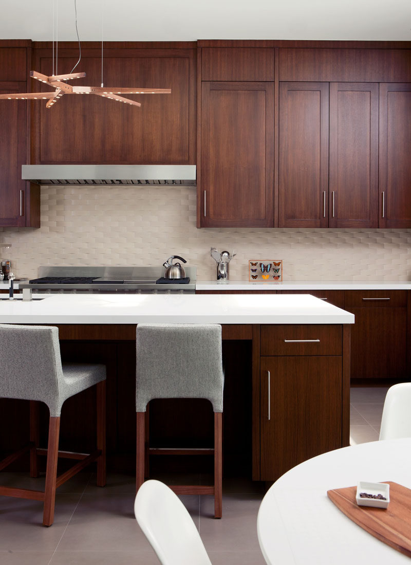 1. The white countertop that wraps around the island of this kitchen keeps the dark wood from being over powering and helps create flow throughout the space.