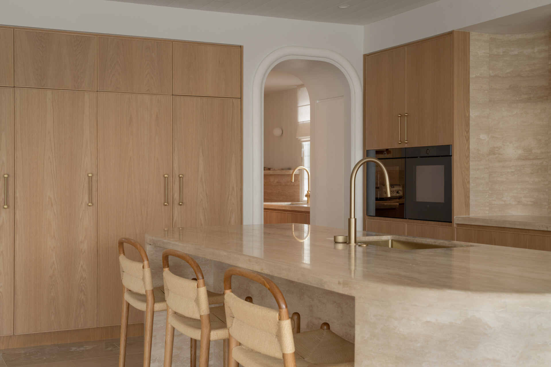 The kitchen continues the story of curated texture. Travertine is rounded and concaved to look impossibly soft, making every surface feel inviting. A minimal palette keeps the focus on materiality. Nearby, a large walk-in pantry echoes the materials of the kitchen.