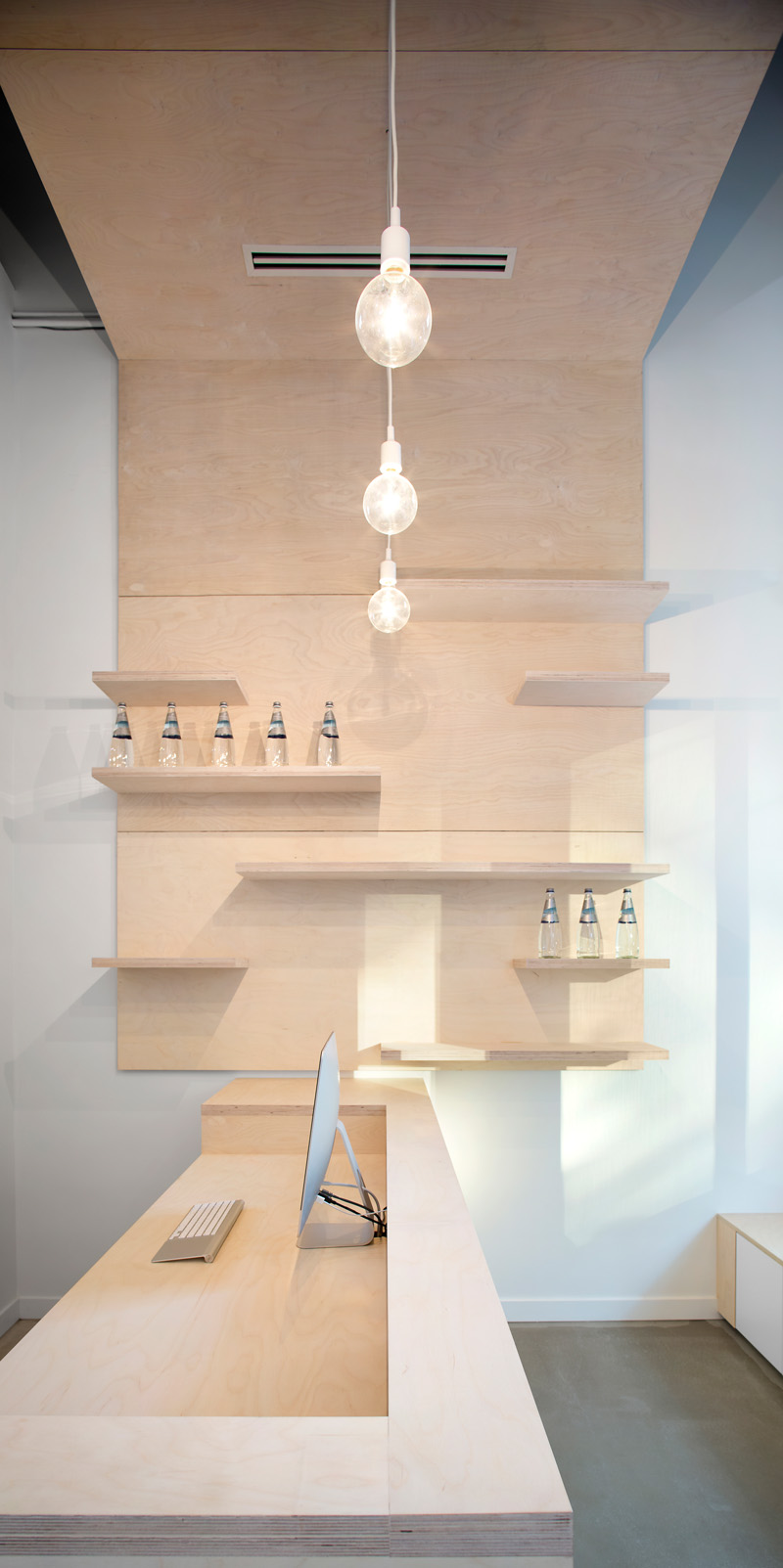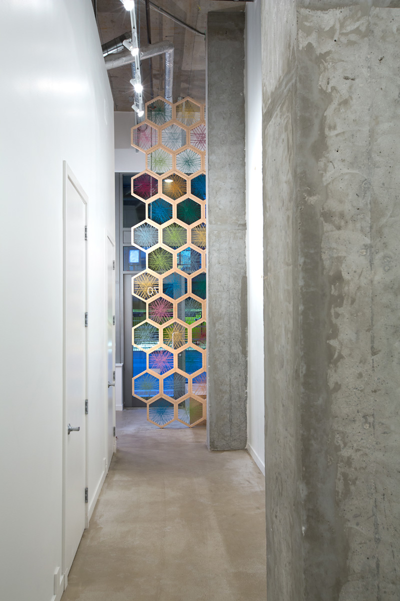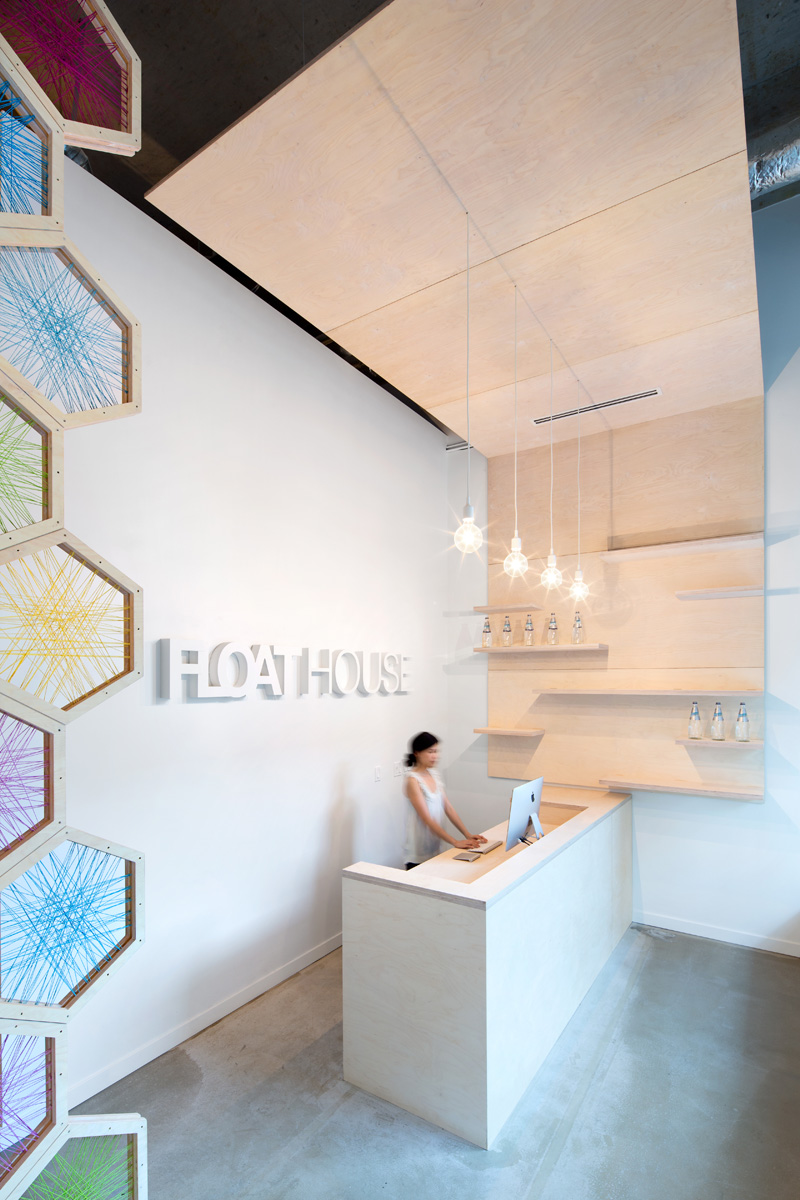 Office of McFarlane Biggar (omb) designed the FloatHouse, a floatation center in Vancouver, Canada, that welcomes you into the space with a 17 foot tall screen made from birchwood hexagons woven with colourful hemp twine.