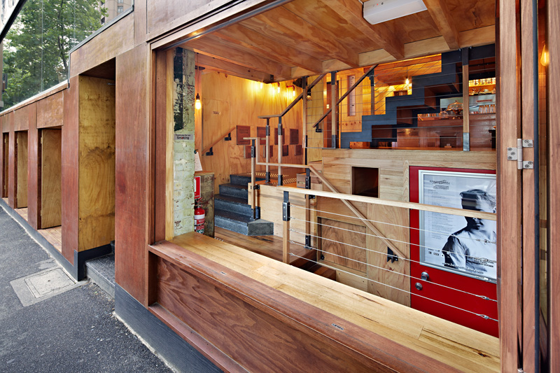 Flipboard Cafe, carved from a lost site in the city, is a tiny multi-level nook that serves fine space with a side of excellent coffee and healthy food. The cafe is nestled in the intersection of an emergency exit from Bennetts Lane Jazz Club below, the thoroughfare to Brolly Studios behind, and a two decade old unused shop-front window.