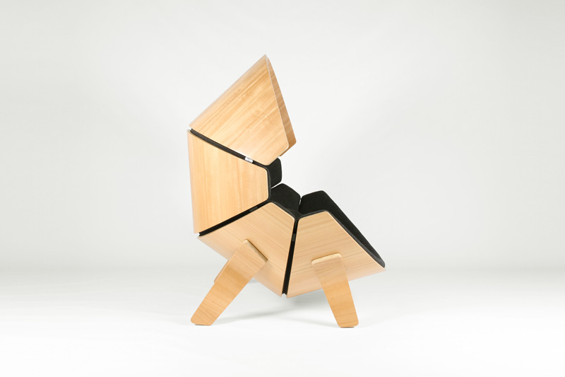 Gaps between each bent ply section allow dirt to fall through and each upholstered panel is fixed to the chair using clips that allow them to be easily removed for cleaning or replacement. Additionally, the chair can be broken down to fit into a small box for more efficient and sustainable shipping.