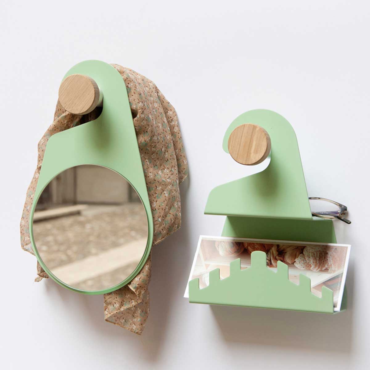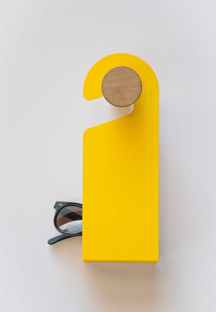 It’s an original wall hanger set, its design is fresh and captivating. It’s made in metal sheet and wood. The shape is ironical about the famous door hanger. Each element is characterized by a special function, that makes it an indispensable daily friend.