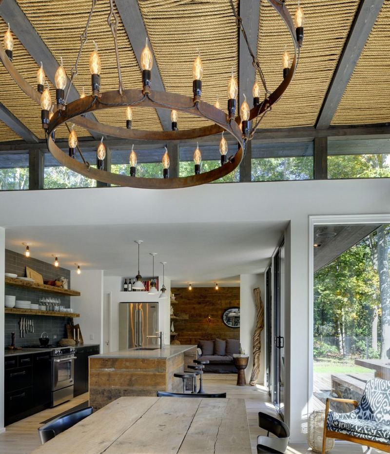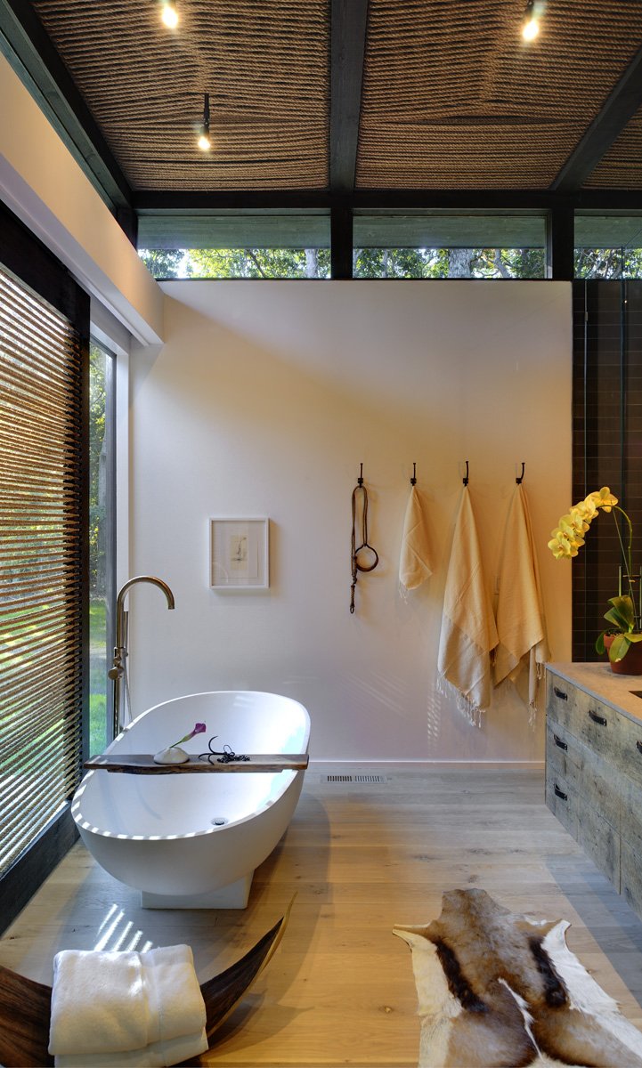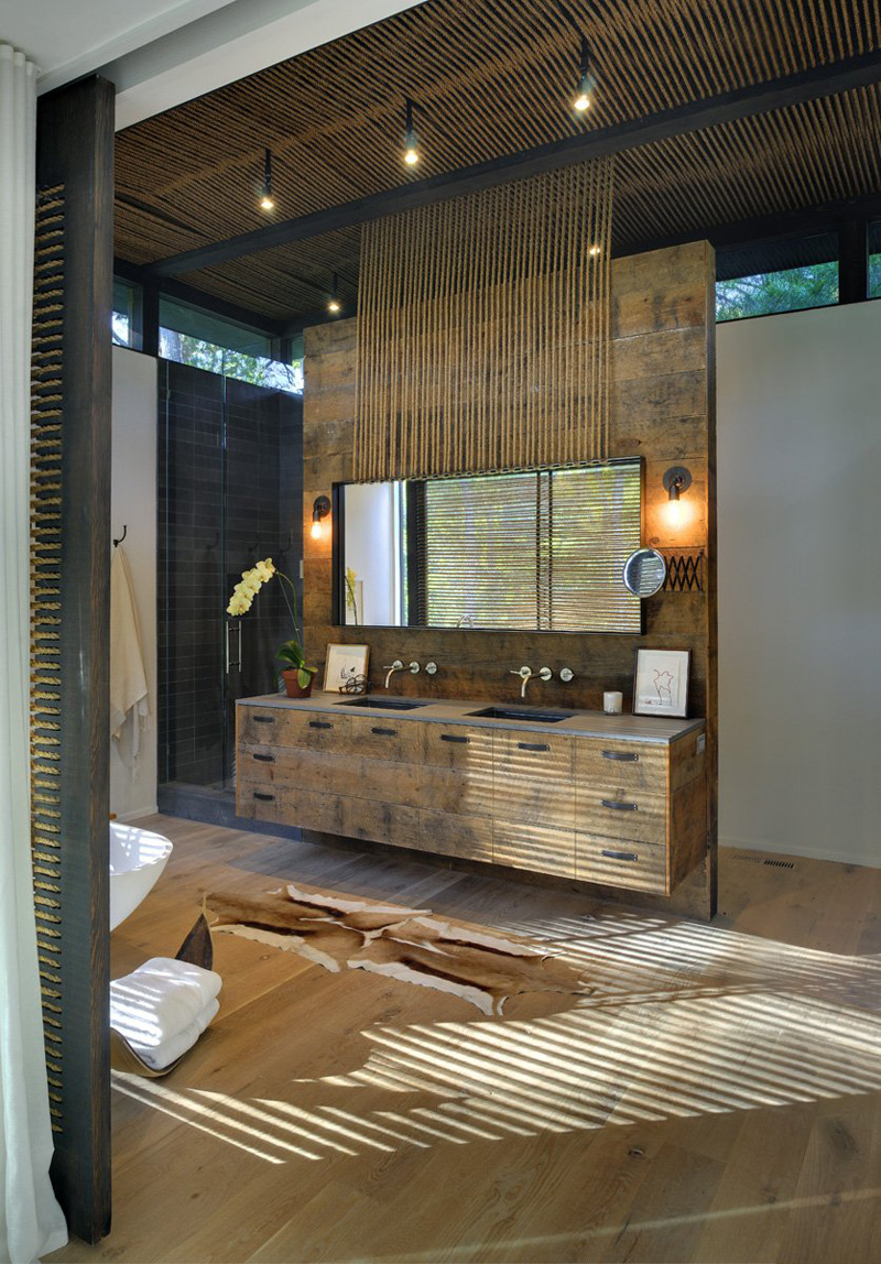 To integrate with the décor, the rope was used structurally to support several items such as a large, custom steel framed mirror in the Master Bathroom and the Dining Room Chandelier. A large sliding door is woven with the same rope to provide privacy from the neighbors and shield the sun at various times of the day. The sunlight rakes through the openings casting linear shadows on the bathroom floor.