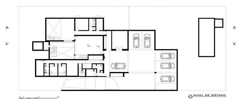 To gain more garden space the house was developed as a three level structure; the study, play room parking, and service area were built underground, while on the ground floor the living room, dinning, kitchen and office open up in search of views of the landscape. On the second floor of the house you find the private spaces around a family room, controlling the views and maintaining its privacy.