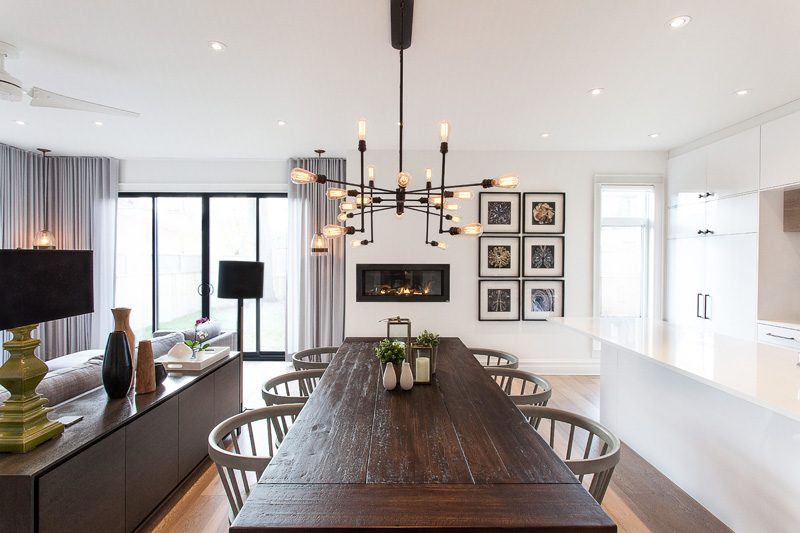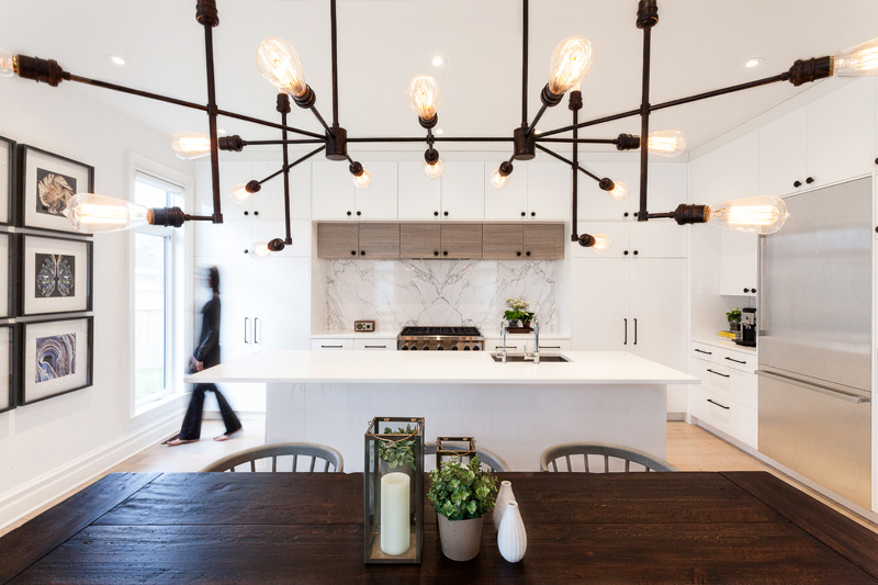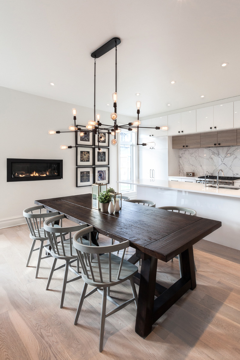 The main floor addition contains a kitchen, dining, and lounge area – all open to one another. The central rustic 14 person dining table is the first viewpoint entering into this addition. A grand light fixture is suspended above the table with a linear fireplace at the far end of the table to draw you into the space. The kitchen was designed to fade away when not in use. The main kitchen wall has an archway of cabinets that surround the cooking area with a book-matched marble backsplash. At the other end of the space is the lounge with a TV blended and mounted on top of a wood feature wall.