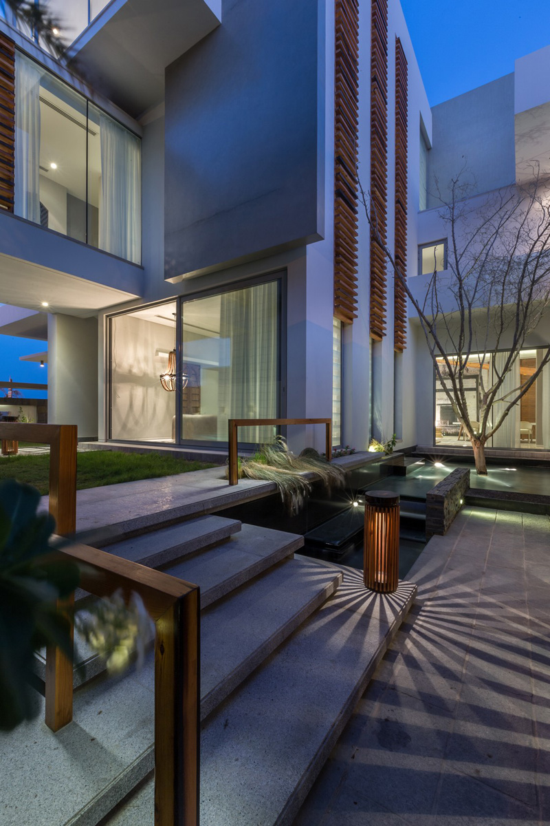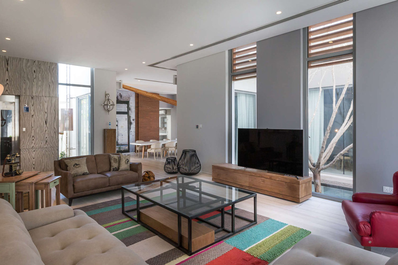 Difference of levels and double heights perk up the interiors. Large floor to ceiling glasses connect the outside with the inside.