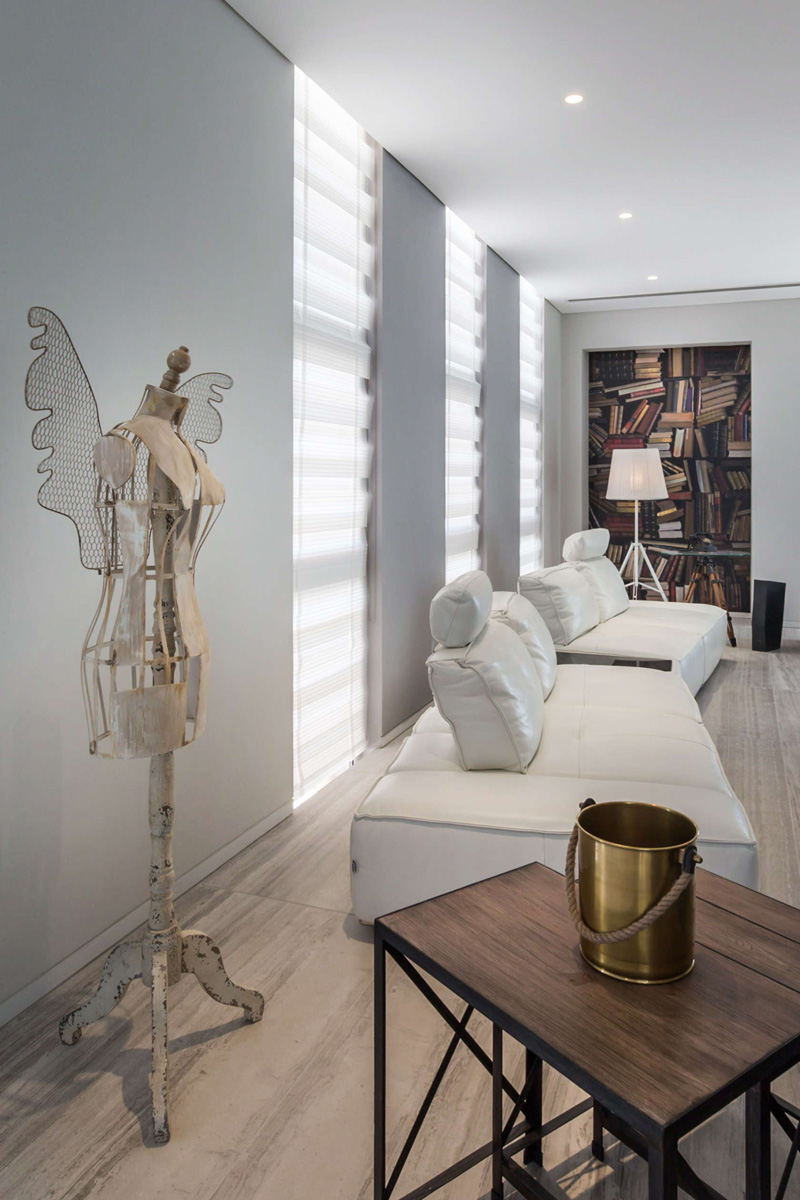 Specks of colours were used in furniture and artifacts only keeping the basic canvas neutral (in greys and whites). Grey white traventino were used as floors. Walls were in shades of greys and ceiling were pristine white. Distressed wallpapers were used on strategic walls.