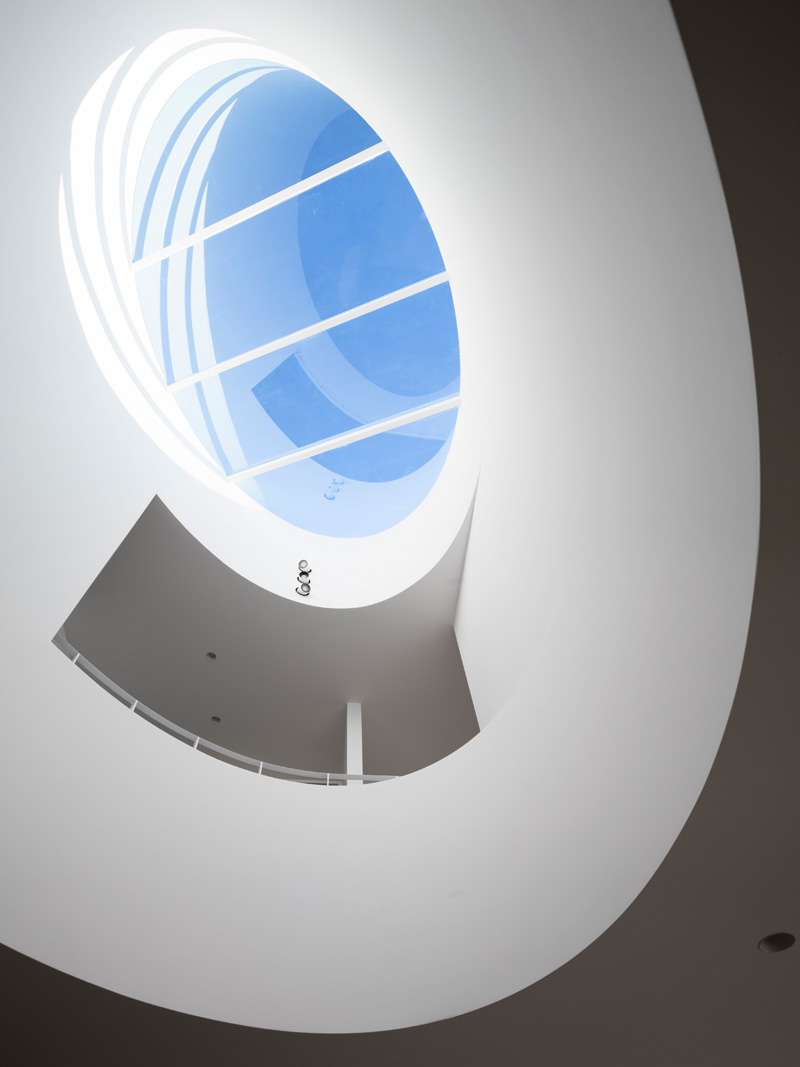 An oval skylight through the very centre of the house introduces an element of rococo surprise to balance the otherwise rectilinear plan. While a simple white form, the play of light & shadow across the oval changes throughout the day & night animating all spaces of the house.