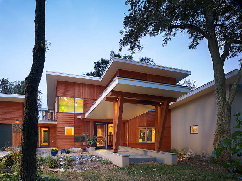 Despite its pedestrian character and inadequate size, the house did have one thing going for it—it sat on the right place on its site, within a ring of mature trees. Because of its siting, and because the owners were concerned about conserving natural resources, a decision was made not to tear down and relocate the house. Instead, the design parti was to keep the box of the original house as the central core, add two wings which help make outdoor spaces and optimize the sun path, and rethink the building massing.