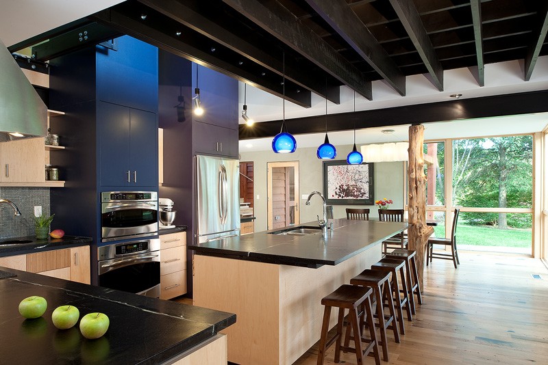 This new opening connects the centrally located kitchen to the children’s areas above, and drops daylight into the center of the house. One new wing is an open living room, connected to the kitchen and outdoors. The other new wing is dedicated to more private rooms, including the master suite, yoga room, and library.