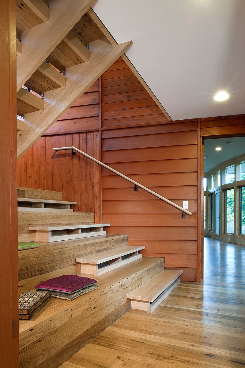 Building materials used in the project express the owners’ earthy aesthetic and environmentally conscious philosophy. Found boulders are placed as sculptural objects, both within the house and in the landscape. Cedar tree trunks were used structurally in the kitchen and yoga room. The building is skinned in cedar siding, arranged in horizontal and vertical patterns and punctuated by art panels.