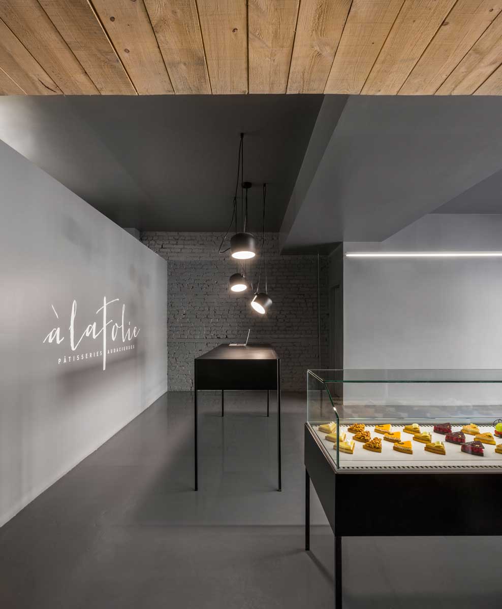 The design of the new address of the patisserie À La Folie aims to defy all typecasts of the conventional pastry shop by giving full prominence to the superior presentation and quality of its unique products.