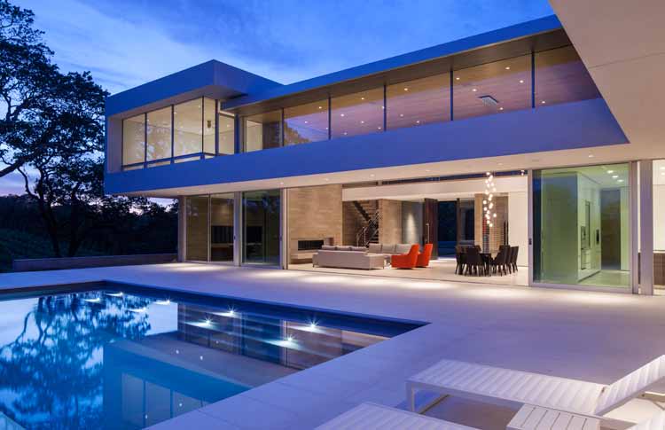 The detached guest suite, envisioned as a glass box projecting beyond the terrace edge, functions as a separate building while remaining connected to the main house by the low roof that spans between the structures.