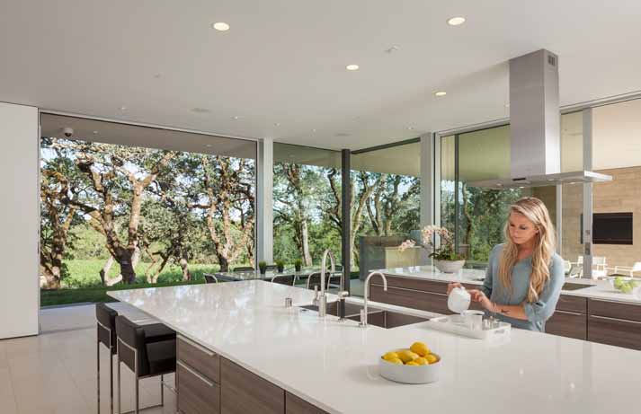 Below, the kitchen and office both open up to the pool terrace, and in the great room a twenty-one-foot wide span of full-height sliding glass doors seamlessly extends the living space out onto the St. Tropez limestone pool terrace.