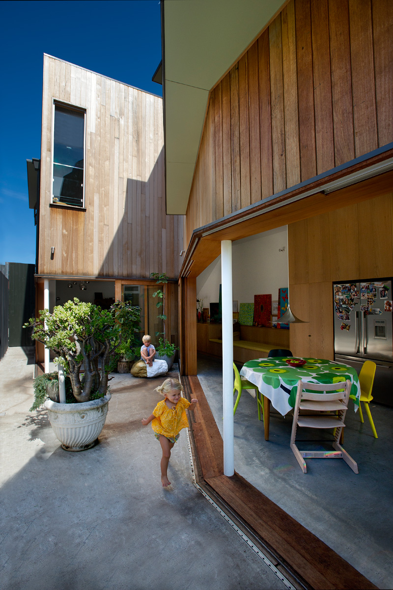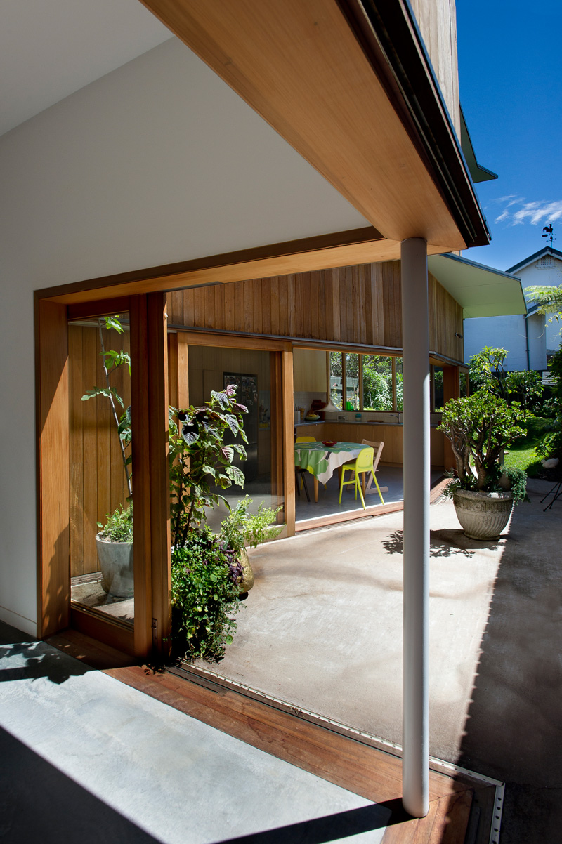 A wedge shaped courtyard is carved from the northern side of the building. It acts like a funnel, drawing in northern light. Sliding doors peel back from the facade, connecting interior with exterior.