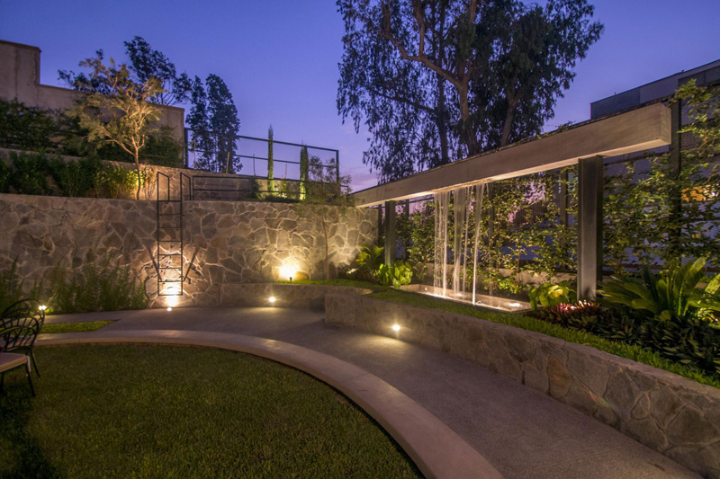 The vegetation was thoughtfully planned. There are trees in the high terraces which will form a green curtain as they grow. For the perimetric walls we chose a creeper. The area of the fountain forms a reflecting surface of water with a tropical air, while the terraces project a dry air with the character of the Andes.