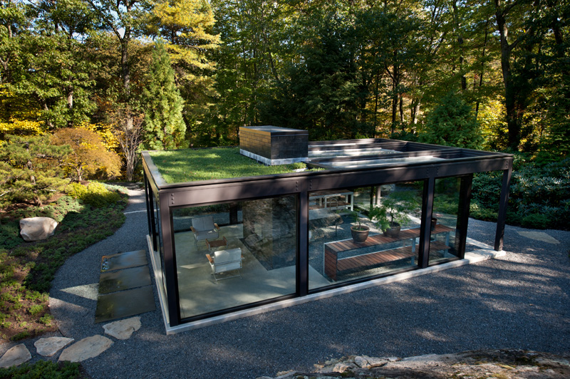 Our clients wished for a greenhouse where they could practice the art of training bonsai trees. Colin Flavin of Flavin Architects collaborated with Peter White of Zen Associates on the design of this modern glass house set in the garden. White suggested the idea of transforming Philip Johnson’s glass house.