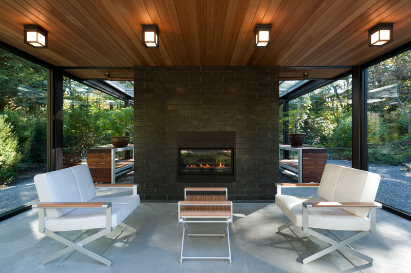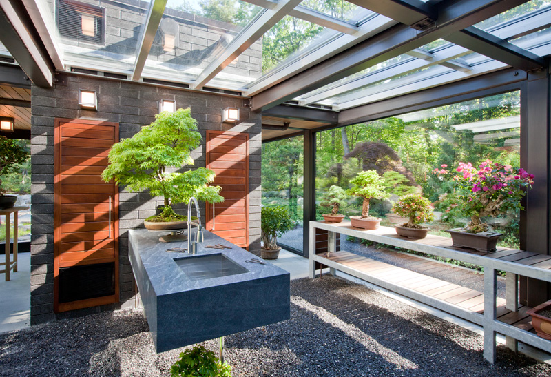 Boston firm Flavin Architects have collaborated with Zen Associates to design a ‘Glass House In The Garden’, a small glass-walled building in a backyard, that includes a nice relaxing tearoom and a greenhouse for the owner’s bonsai plant collection.