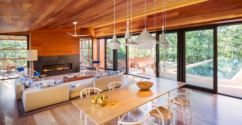 The cedar lined living and dining spaces combine to form a Great Room, with a wall of sliding glass doors looking out onto the pool and deck.
