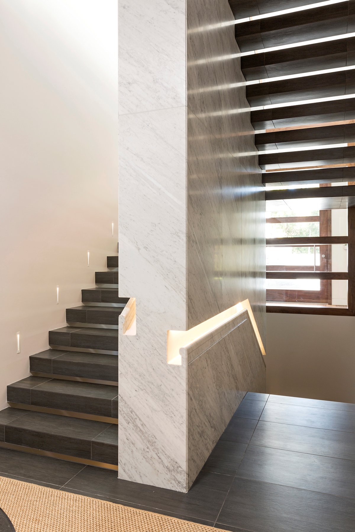 The home’s interiors feature the highest quality materials, from a marble-clad stairwell to custom recessed lighting and American black walnut flooring. There is an abundance of natural light throughout and the high ceilings give a feeling of generous volume to every space.