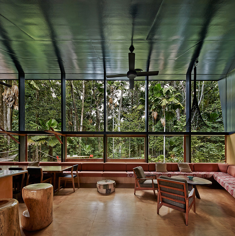 The interior has been kept light with the space clad with plywood, that opens out to the rainforest surrounds, and engages the canopy through tall south-facing windows.