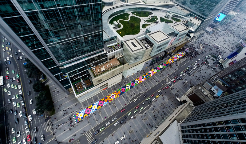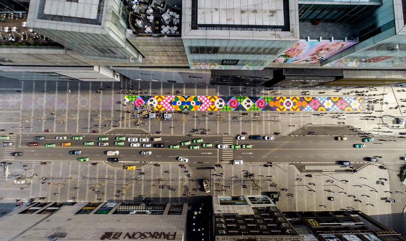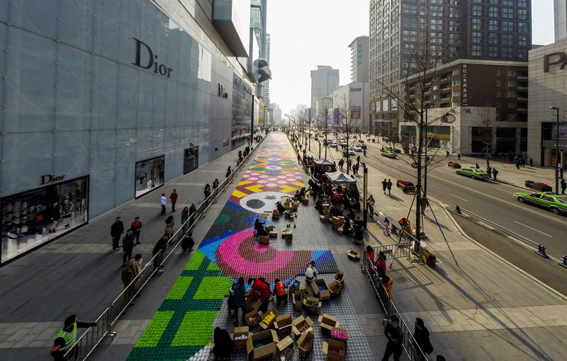 The exhibition was curated by Hong Kong creative studio AllRightsReserved to bring awareness to the plight of underprivileged children in rural areas. The artwork within the candy carpet encompasses a variety of symbology, from blooming flowers which symbolize good luck to stylized pandas, Chengdu being their ‘hometown’.